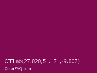 CIELab 27.828,51.171,-9.807 Color is a dark magenta color and the nearest color is French Plum #811453. Hex code #800952 and RGB value is rgb(128,9,82). In RGB color space, this color is composed of 50% red, 4% green, 32% blue, In CMYK color space, this color is composed of 0% cyan, 93% magenta, 36% yellow , 50% black , In HSL color space, this color has a hue angle of 323° , 87% saturation and 27% lightness.