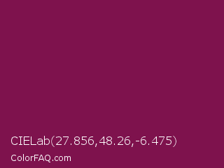 CIELab 27.856,48.26,-6.475 Color is a dark magenta color and the nearest color is French Plum #811453. Hex code #7e124d and RGB value is rgb(126,18,77). In RGB color space, this color is composed of 49% red, 7% green, 30% blue, In CMYK color space, this color is composed of 0% cyan, 86% magenta, 39% yellow , 51% black , In HSL color space, this color has a hue angle of 327° , 75% saturation and 28% lightness.