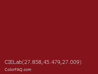 CIELab 27.858,45.479,27.009 Color is a dark red color and the nearest color is Falu Red #801818. Hex code #83141b and RGB value is rgb(131,20,27). In RGB color space, this color is composed of 51% red, 8% green, 11% blue, In CMYK color space, this color is composed of 0% cyan, 85% magenta, 79% yellow , 49% black , In HSL color space, this color has a hue angle of 356° , 74% saturation and 30% lightness.