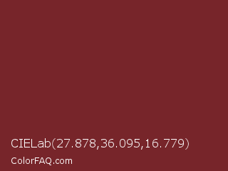 CIELab 27.878,36.095,16.779 Color is a normal red color and the nearest color is Crown Of Thorns #771f1f. Hex code #77252a and RGB value is rgb(119,37,42). In RGB color space, this color is composed of 47% red, 15% green, 16% blue, In CMYK color space, this color is composed of 0% cyan, 69% magenta, 65% yellow , 53% black , In HSL color space, this color has a hue angle of 356° , 53% saturation and 31% lightness.