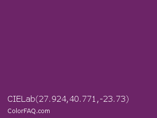 CIELab 27.924,40.771,-23.73 Color is a dark magenta color and the nearest color is Byzantium #702963. Hex code #6c2467 and RGB value is rgb(108,36,103). In RGB color space, this color is composed of 42% red, 14% green, 40% blue, In CMYK color space, this color is composed of 0% cyan, 67% magenta, 5% yellow , 58% black , In HSL color space, this color has a hue angle of 304° , 50% saturation and 28% lightness.