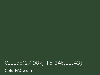 CIELab 27.987,-15.346,11.43 Color is a dark green color and the nearest color is Kombu Green #354230. Hex code #2f4830 and RGB value is rgb(47,72,48). In RGB color space, this color is composed of 18% red, 28% green, 19% blue, In CMYK color space, this color is composed of 35% cyan, 0% magenta, 33% yellow , 72% black , In HSL color space, this color has a hue angle of 122° , 21% saturation and 23% lightness.