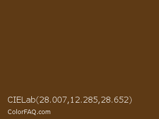 CIELab 28.007,12.285,28.652 Color is a dark orange color and the nearest color is Pullman Brown UPS Brown #644117. Hex code #5e3a15 and RGB value is rgb(94,58,21). In RGB color space, this color is composed of 37% red, 23% green, 8% blue, In CMYK color space, this color is composed of 0% cyan, 38% magenta, 78% yellow , 63% black , In HSL color space, this color has a hue angle of 30° , 63% saturation and 23% lightness.