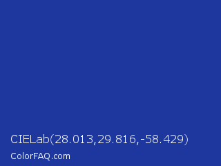 CIELab 28.013,29.816,-58.429 Color is a normal blue color and the nearest color is Egyptian Blue #1034a6. Hex code #1d379e and RGB value is rgb(29,55,158). In RGB color space, this color is composed of 11% red, 22% green, 62% blue, In CMYK color space, this color is composed of 82% cyan, 65% magenta, 0% yellow , 38% black , In HSL color space, this color has a hue angle of 228° , 69% saturation and 37% lightness.