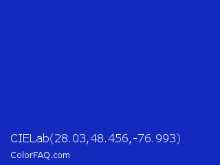 CIELab 28.03,48.456,-76.993 Color is a normal blue color and the nearest color is Persian Blue #1c39bb. Hex code #132abd and RGB value is rgb(19,42,189). In RGB color space, this color is composed of 7% red, 16% green, 74% blue, In CMYK color space, this color is composed of 90% cyan, 78% magenta, 0% yellow , 26% black , In HSL color space, this color has a hue angle of 232° , 82% saturation and 41% lightness.