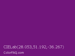 CIELab 28.053,51.192,-36.267 Color is a dark magenta color and the nearest color is Midnight #702670. Hex code #71157b and RGB value is rgb(113,21,123). In RGB color space, this color is composed of 44% red, 8% green, 48% blue, In CMYK color space, this color is composed of 8% cyan, 83% magenta, 0% yellow , 52% black , In HSL color space, this color has a hue angle of 294° , 71% saturation and 28% lightness.