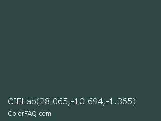 CIELab 28.065,-10.694,-1.365 Color is a dark cyan color and the nearest color is Japanese Indigo #264348. Hex code #2d4744 and RGB value is rgb(45,71,68). In RGB color space, this color is composed of 18% red, 28% green, 27% blue, In CMYK color space, this color is composed of 37% cyan, 0% magenta, 4% yellow , 72% black , In HSL color space, this color has a hue angle of 173° , 22% saturation and 23% lightness.