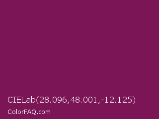 CIELab 28.096,48.001,-12.125 Color is a dark magenta color and the nearest color is French Plum #811453. Hex code #7c1556 and RGB value is rgb(124,21,86). In RGB color space, this color is composed of 49% red, 8% green, 34% blue, In CMYK color space, this color is composed of 0% cyan, 83% magenta, 31% yellow , 51% black , In HSL color space, this color has a hue angle of 322° , 71% saturation and 28% lightness.