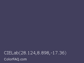 CIELab 28.124,8.898,-17.36 Color is a normal indigo color and the nearest color is Gun Powder #414257. Hex code #423f5d and RGB value is rgb(66,63,93). In RGB color space, this color is composed of 26% red, 25% green, 36% blue, In CMYK color space, this color is composed of 29% cyan, 32% magenta, 0% yellow , 64% black , In HSL color space, this color has a hue angle of 246° , 19% saturation and 31% lightness.