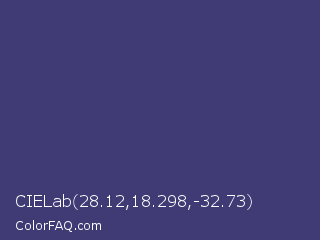 CIELab 28.12,18.298,-32.73 Color is a normal indigo color and the nearest color is Minsk #3f307f. Hex code #403b75 and RGB value is rgb(64,59,117). In RGB color space, this color is composed of 25% red, 23% green, 46% blue, In CMYK color space, this color is composed of 45% cyan, 50% magenta, 0% yellow , 54% black , In HSL color space, this color has a hue angle of 245° , 33% saturation and 35% lightness.