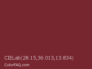 CIELab 28.15,36.013,13.834 Color is a normal red color and the nearest color is Wine #722f37. Hex code #77262f and RGB value is rgb(119,38,47). In RGB color space, this color is composed of 47% red, 15% green, 18% blue, In CMYK color space, this color is composed of 0% cyan, 68% magenta, 61% yellow , 53% black , In HSL color space, this color has a hue angle of 353° , 52% saturation and 31% lightness.