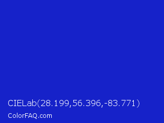 CIELab 28.199,56.396,-83.771 Color is a normal blue color and the nearest color is Persian Blue #1c39bb. Hex code #1622c9 and RGB value is rgb(22,34,201). In RGB color space, this color is composed of 9% red, 13% green, 79% blue, In CMYK color space, this color is composed of 89% cyan, 83% magenta, 0% yellow , 21% black , In HSL color space, this color has a hue angle of 236° , 80% saturation and 44% lightness.