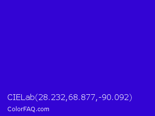 CIELab 28.232,68.877,-90.092 Color is a normal indigo color and the nearest color is Interdimensional Blue #360ccc. Hex code #3304d4 and RGB value is rgb(51,4,212). In RGB color space, this color is composed of 20% red, 2% green, 83% blue, In CMYK color space, this color is composed of 76% cyan, 98% magenta, 0% yellow , 17% black , In HSL color space, this color has a hue angle of 254° , 96% saturation and 42% lightness.