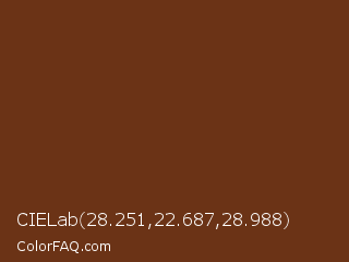 CIELab 28.251,22.687,28.988 Color is a dark orange color and the nearest color is Hairy Heath #6b2a14. Hex code #6b3316 and RGB value is rgb(107,51,22). In RGB color space, this color is composed of 42% red, 20% green, 9% blue, In CMYK color space, this color is composed of 0% cyan, 52% magenta, 79% yellow , 58% black , In HSL color space, this color has a hue angle of 20° , 66% saturation and 25% lightness.