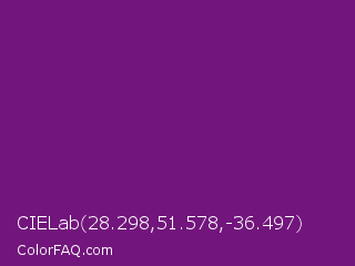 CIELab 28.298,51.578,-36.497 Color is a dark magenta color and the nearest color is Midnight #702670. Hex code #72157c and RGB value is rgb(114,21,124). In RGB color space, this color is composed of 45% red, 8% green, 49% blue, In CMYK color space, this color is composed of 8% cyan, 83% magenta, 0% yellow , 51% black , In HSL color space, this color has a hue angle of 294° , 71% saturation and 28% lightness.