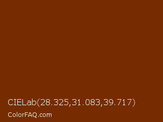 CIELab 28.325,31.083,39.717 Color is a dark orange color and the nearest color is Red Beech #7b3801. Hex code #762b00 and RGB value is rgb(118,43,0). In RGB color space, this color is composed of 46% red, 17% green, 0% blue, In CMYK color space, this color is composed of 0% cyan, 64% magenta, 100% yellow , 54% black , In HSL color space, this color has a hue angle of 22° , 100% saturation and 23% lightness.
