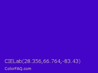 CIELab 28.356,66.764,-83.43 Color is a normal indigo color and the nearest color is Interdimensional Blue #360ccc. Hex code #4505c9 and RGB value is rgb(69,5,201). In RGB color space, this color is composed of 27% red, 2% green, 79% blue, In CMYK color space, this color is composed of 66% cyan, 98% magenta, 0% yellow , 21% black , In HSL color space, this color has a hue angle of 260° , 95% saturation and 40% lightness.
