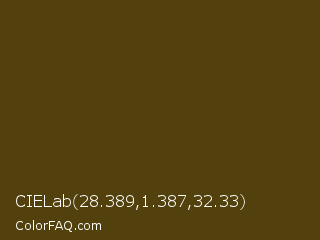 CIELab 28.389,1.387,32.33 Color is a very dark orange color and the nearest color is Bronze Olive #4e420c. Hex code #52410d and RGB value is rgb(82,65,13). In RGB color space, this color is composed of 32% red, 25% green, 5% blue, In CMYK color space, this color is composed of 0% cyan, 21% magenta, 84% yellow , 68% black , In HSL color space, this color has a hue angle of 45° , 73% saturation and 19% lightness.