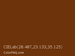 CIELab 28.487,23.133,35.125 Color is a dark orange color and the nearest color is Nutmeg Wood Finish #683600. Hex code #6d330a and RGB value is rgb(109,51,10). In RGB color space, this color is composed of 43% red, 20% green, 4% blue, In CMYK color space, this color is composed of 0% cyan, 53% magenta, 91% yellow , 57% black , In HSL color space, this color has a hue angle of 25° , 83% saturation and 23% lightness.