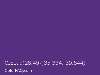 CIELab 28.497,35.334,-39.544 Color is a normal violet color and the nearest color is Regalia #522d80. Hex code #572f81 and RGB value is rgb(87,47,129). In RGB color space, this color is composed of 34% red, 18% green, 51% blue, In CMYK color space, this color is composed of 33% cyan, 64% magenta, 0% yellow , 49% black , In HSL color space, this color has a hue angle of 269° , 47% saturation and 35% lightness.