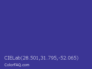 CIELab 28.501,31.795,-52.065 Color is a normal indigo color and the nearest color is Blue Pigment #333399. Hex code #3b3595 and RGB value is rgb(59,53,149). In RGB color space, this color is composed of 23% red, 21% green, 58% blue, In CMYK color space, this color is composed of 60% cyan, 64% magenta, 0% yellow , 42% black , In HSL color space, this color has a hue angle of 244° , 48% saturation and 40% lightness.