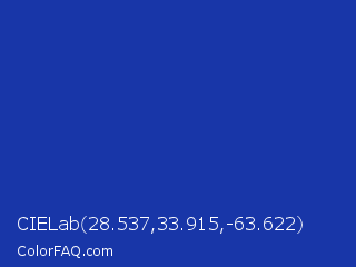 CIELab 28.537,33.915,-63.622 Color is a normal blue color and the nearest color is Egyptian Blue #1034a6. Hex code #1836a8 and RGB value is rgb(24,54,168). In RGB color space, this color is composed of 9% red, 21% green, 66% blue, In CMYK color space, this color is composed of 86% cyan, 68% magenta, 0% yellow , 34% black , In HSL color space, this color has a hue angle of 228° , 75% saturation and 38% lightness.