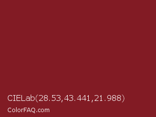 CIELab 28.53,43.441,21.988 Color is a normal red color and the nearest color is Merlot #831923. Hex code #821b24 and RGB value is rgb(130,27,36). In RGB color space, this color is composed of 51% red, 11% green, 14% blue, In CMYK color space, this color is composed of 0% cyan, 79% magenta, 72% yellow , 49% black , In HSL color space, this color has a hue angle of 355° , 66% saturation and 31% lightness.