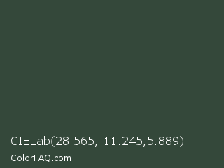 CIELab 28.565,-11.245,5.889 Color is a dark green color and the nearest color is Lunar Green #3c493a. Hex code #34483a and RGB value is rgb(52,72,58). In RGB color space, this color is composed of 20% red, 28% green, 23% blue, In CMYK color space, this color is composed of 28% cyan, 0% magenta, 19% yellow , 72% black , In HSL color space, this color has a hue angle of 138° , 16% saturation and 24% lightness.