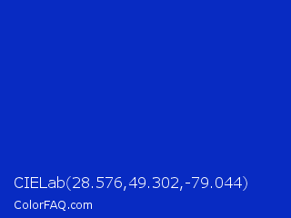 CIELab 28.576,49.302,-79.044 Color is a normal blue color and the nearest color is Persian Blue #1c39bb. Hex code #082bc2 and RGB value is rgb(8,43,194). In RGB color space, this color is composed of 3% red, 17% green, 76% blue, In CMYK color space, this color is composed of 96% cyan, 78% magenta, 0% yellow , 24% black , In HSL color space, this color has a hue angle of 229° , 92% saturation and 40% lightness.