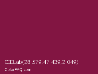 CIELab 28.579,47.439,2.049 Color is a dark rose color and the nearest color is Rose Bud Cherry #800b47. Hex code #821542 and RGB value is rgb(130,21,66). In RGB color space, this color is composed of 51% red, 8% green, 26% blue, In CMYK color space, this color is composed of 0% cyan, 84% magenta, 49% yellow , 49% black , In HSL color space, this color has a hue angle of 335° , 72% saturation and 30% lightness.