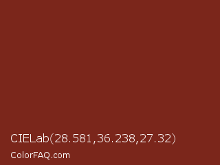 CIELab 28.581,36.238,27.32 Color is a dark red color and the nearest color is Mocha #782d19. Hex code #7b261b and RGB value is rgb(123,38,27). In RGB color space, this color is composed of 48% red, 15% green, 11% blue, In CMYK color space, this color is composed of 0% cyan, 69% magenta, 78% yellow , 52% black , In HSL color space, this color has a hue angle of 7° , 64% saturation and 29% lightness.