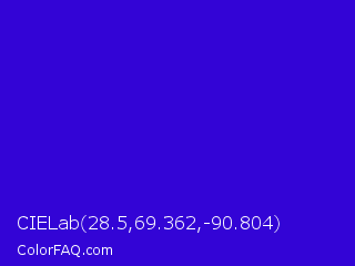 CIELab 28.5,69.362,-90.804 Color is a normal indigo color and the nearest color is Interdimensional Blue #360ccc. Hex code #3304d6 and RGB value is rgb(51,4,214). In RGB color space, this color is composed of 20% red, 2% green, 84% blue, In CMYK color space, this color is composed of 76% cyan, 98% magenta, 0% yellow , 16% black , In HSL color space, this color has a hue angle of 253° , 96% saturation and 43% lightness.