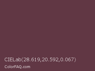 CIELab 28.619,20.592,0.067 Color is a dark rose color and the nearest color is Wine Dregs #673147. Hex code #613744 and RGB value is rgb(97,55,68). In RGB color space, this color is composed of 38% red, 22% green, 27% blue, In CMYK color space, this color is composed of 0% cyan, 43% magenta, 30% yellow , 62% black , In HSL color space, this color has a hue angle of 341° , 28% saturation and 30% lightness.