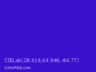 CIELab 28.619,64.948,-84.77 Color is a normal indigo color and the nearest color is Interdimensional Blue #360ccc. Hex code #3c10cc and RGB value is rgb(60,16,204). In RGB color space, this color is composed of 24% red, 6% green, 80% blue, In CMYK color space, this color is composed of 71% cyan, 92% magenta, 0% yellow , 20% black , In HSL color space, this color has a hue angle of 254° , 85% saturation and 43% lightness.