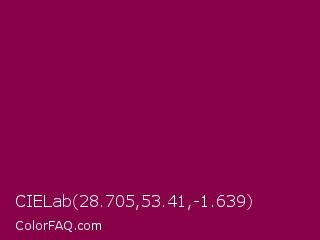CIELab 28.705,53.41,-1.639 Color is a dark rose color and the nearest color is Rose Bud Cherry #800b47. Hex code #880148 and RGB value is rgb(136,1,72). In RGB color space, this color is composed of 53% red, 0% green, 28% blue, In CMYK color space, this color is composed of 0% cyan, 99% magenta, 47% yellow , 47% black , In HSL color space, this color has a hue angle of 328° , 99% saturation and 27% lightness.