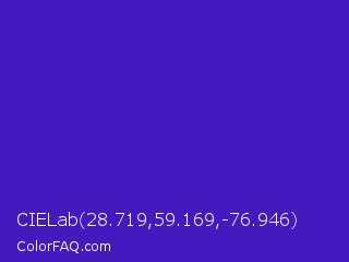CIELab 28.719,59.169,-76.946 Color is a normal indigo color and the nearest color is Interdimensional Blue #360ccc. Hex code #441abf and RGB value is rgb(68,26,191). In RGB color space, this color is composed of 27% red, 10% green, 75% blue, In CMYK color space, this color is composed of 64% cyan, 86% magenta, 0% yellow , 25% black , In HSL color space, this color has a hue angle of 255° , 76% saturation and 43% lightness.