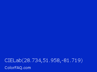 CIELab 28.734,51.958,-81.719 Color is a normal blue color and the nearest color is UA Blue #0033aa. Hex code #0429c7 and RGB value is rgb(4,41,199). In RGB color space, this color is composed of 2% red, 16% green, 78% blue, In CMYK color space, this color is composed of 98% cyan, 79% magenta, 0% yellow , 22% black , In HSL color space, this color has a hue angle of 229° , 96% saturation and 40% lightness.