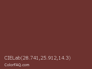 CIELab 28.741,25.912,14.3 Color is a normal red color and the nearest color is Wine #722f37. Hex code #6d322f and RGB value is rgb(109,50,47). In RGB color space, this color is composed of 43% red, 20% green, 18% blue, In CMYK color space, this color is composed of 0% cyan, 54% magenta, 57% yellow , 57% black , In HSL color space, this color has a hue angle of 3° , 40% saturation and 31% lightness.