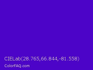 CIELab 28.765,66.844,-81.558 Color is a normal violet color and the nearest color is Interdimensional Blue #360ccc. Hex code #4c04c7 and RGB value is rgb(76,4,199). In RGB color space, this color is composed of 30% red, 2% green, 78% blue, In CMYK color space, this color is composed of 62% cyan, 98% magenta, 0% yellow , 22% black , In HSL color space, this color has a hue angle of 262° , 96% saturation and 40% lightness.