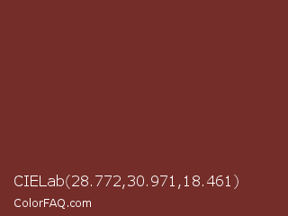 CIELab 28.772,30.971,18.461 Color is a normal red color and the nearest color is Liver Organ #6c2e1f. Hex code #742d29 and RGB value is rgb(116,45,41). In RGB color space, this color is composed of 45% red, 18% green, 16% blue, In CMYK color space, this color is composed of 0% cyan, 61% magenta, 65% yellow , 55% black , In HSL color space, this color has a hue angle of 3° , 48% saturation and 31% lightness.
