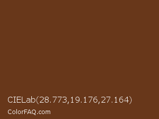CIELab 28.773,19.176,27.164 Color is a dark orange color and the nearest color is Liver Organ #6c2e1f. Hex code #68371a and RGB value is rgb(104,55,26). In RGB color space, this color is composed of 41% red, 22% green, 10% blue, In CMYK color space, this color is composed of 0% cyan, 47% magenta, 75% yellow , 59% black , In HSL color space, this color has a hue angle of 22° , 60% saturation and 25% lightness.
