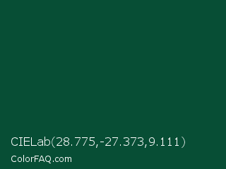 CIELab 28.775,-27.373,9.111 Color is a very dark green color and the nearest color is Sacramento State Green #00563f. Hex code #074e35 and RGB value is rgb(7,78,53). In RGB color space, this color is composed of 3% red, 31% green, 21% blue, In CMYK color space, this color is composed of 91% cyan, 0% magenta, 32% yellow , 69% black , In HSL color space, this color has a hue angle of 159° , 84% saturation and 17% lightness.