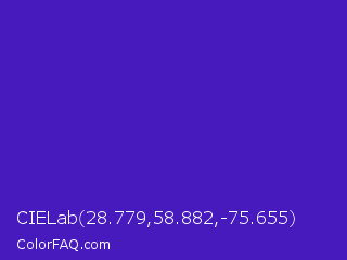 CIELab 28.779,58.882,-75.655 Color is a normal indigo color and the nearest color is Interdimensional Blue #360ccc. Hex code #471abd and RGB value is rgb(71,26,189). In RGB color space, this color is composed of 28% red, 10% green, 74% blue, In CMYK color space, this color is composed of 62% cyan, 86% magenta, 0% yellow , 26% black , In HSL color space, this color has a hue angle of 257° , 76% saturation and 42% lightness.