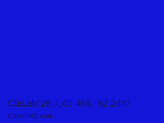 CIELab 28.7,65.469,-92.244 Color is a normal blue color and the nearest color is Bluebonnet #1c1cf0. Hex code #1316d9 and RGB value is rgb(19,22,217). In RGB color space, this color is composed of 7% red, 9% green, 85% blue, In CMYK color space, this color is composed of 91% cyan, 90% magenta, 0% yellow , 15% black , In HSL color space, this color has a hue angle of 239° , 84% saturation and 46% lightness.