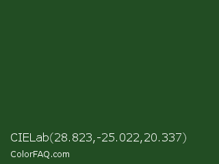 CIELab 28.823,-25.022,20.337 Color is a very dark green color and the nearest color is Cal Poly Pomona Green #1e4d2b. Hex code #224d23 and RGB value is rgb(34,77,35). In RGB color space, this color is composed of 13% red, 30% green, 14% blue, In CMYK color space, this color is composed of 56% cyan, 0% magenta, 55% yellow , 70% black , In HSL color space, this color has a hue angle of 121° , 39% saturation and 22% lightness.