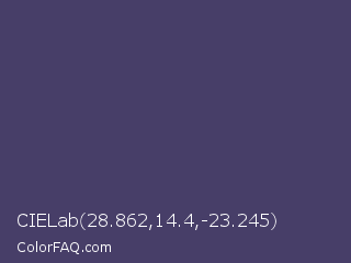 CIELab 28.862,14.4,-23.245 Color is a normal indigo color and the nearest color is Mulled Wine #4e4562. Hex code #473e68 and RGB value is rgb(71,62,104). In RGB color space, this color is composed of 28% red, 24% green, 41% blue, In CMYK color space, this color is composed of 32% cyan, 40% magenta, 0% yellow , 59% black , In HSL color space, this color has a hue angle of 253° , 25% saturation and 33% lightness.