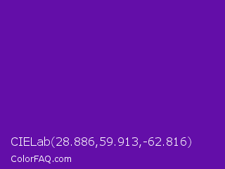 CIELab 28.886,59.913,-62.816 Color is a normal purple color and the nearest color is Purple #660099. Hex code #630ea8 and RGB value is rgb(99,14,168). In RGB color space, this color is composed of 39% red, 5% green, 66% blue, In CMYK color space, this color is composed of 41% cyan, 92% magenta, 0% yellow , 34% black , In HSL color space, this color has a hue angle of 273° , 85% saturation and 36% lightness.