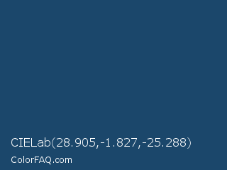 CIELab 28.905,-1.827,-25.288 Color is a dark blue color and the nearest color is Chathams Blue #175579. Hex code #1b476b and RGB value is rgb(27,71,107). In RGB color space, this color is composed of 11% red, 28% green, 42% blue, In CMYK color space, this color is composed of 75% cyan, 34% magenta, 0% yellow , 58% black , In HSL color space, this color has a hue angle of 207° , 60% saturation and 26% lightness.