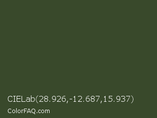 CIELab 28.926,-12.687,15.937 Color is a dark green color and the nearest color is Kombu Green #354230. Hex code #39492b and RGB value is rgb(57,73,43). In RGB color space, this color is composed of 22% red, 29% green, 17% blue, In CMYK color space, this color is composed of 22% cyan, 0% magenta, 41% yellow , 71% black , In HSL color space, this color has a hue angle of 92° , 26% saturation and 23% lightness.