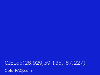 CIELab 28.929,59.135,-87.227 Color is a normal blue color and the nearest color is Bluebonnet #1c1cf0. Hex code #1121d1 and RGB value is rgb(17,33,209). In RGB color space, this color is composed of 7% red, 13% green, 82% blue, In CMYK color space, this color is composed of 92% cyan, 84% magenta, 0% yellow , 18% black , In HSL color space, this color has a hue angle of 235° , 85% saturation and 44% lightness.
